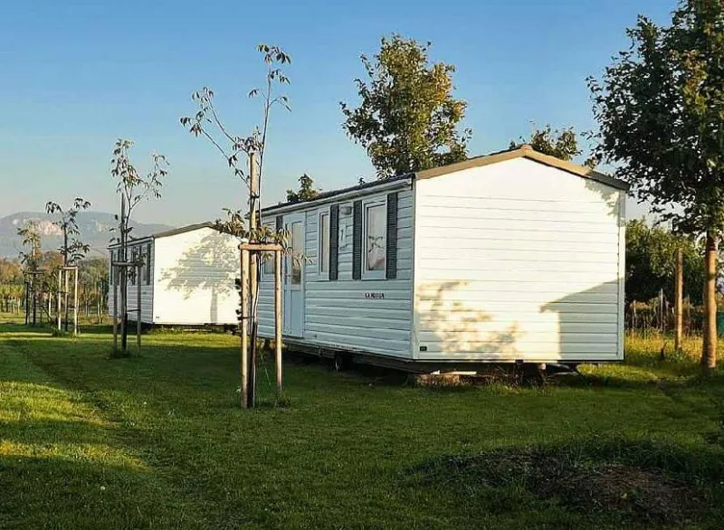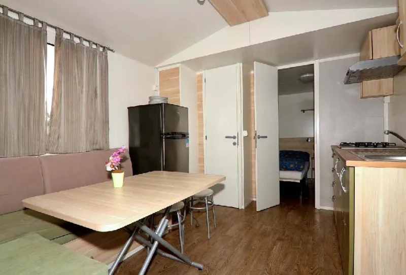 Každý mobilní dům má svoje sociální zařízení. Koupelnu se sprchovým koutem a WC. Dále 2 ložnice a kuchyň s plynový sporákem, lednicí, jídelním stolem atd