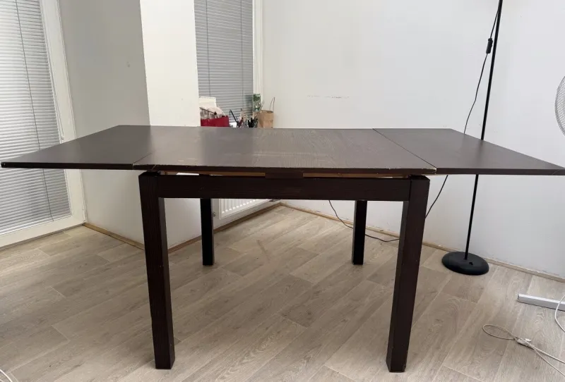 Rozkládací stůl: 90x90 cm ve složeném stavu nebo 165x90 cm ve vysunutém. Nohy vysoké 70 cm.