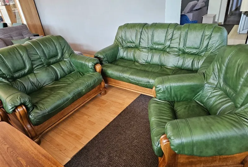 Luxusní kožená sedací souprava potažená pravou hovězí kůží. Sedací souprava se skládá z trojsedu a dvou křesel. Trojsed není rozkládací (v nabídce také varianta s rozkládacím trojsedem). Můžete vybírat z různých barevných provedení kůže i dřeva. Celá kostra sedací soupravy je vyrobena z dubového masivu, který zaručuje její dlouhou životnost. Vyplněna je bonellovými pružinami.