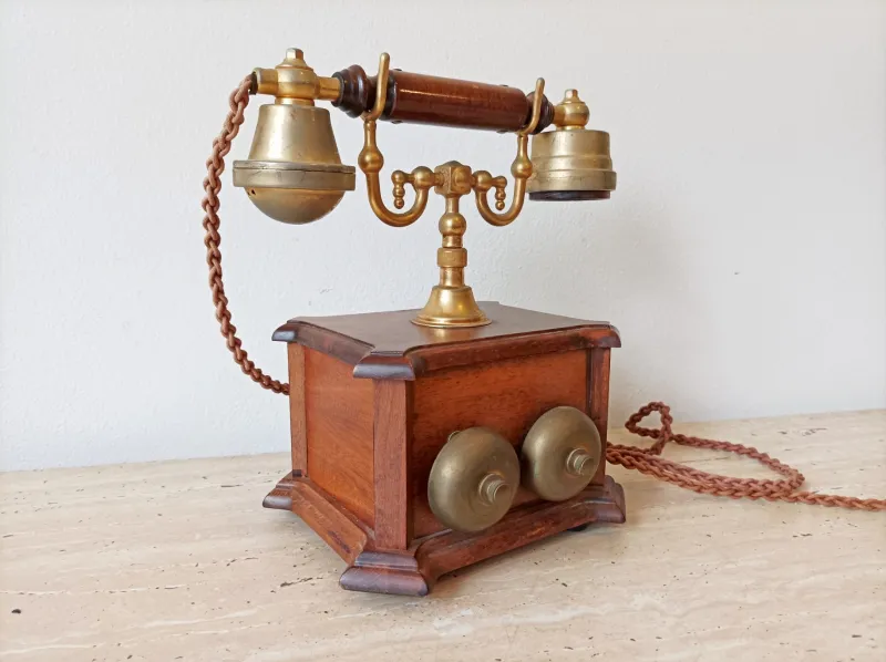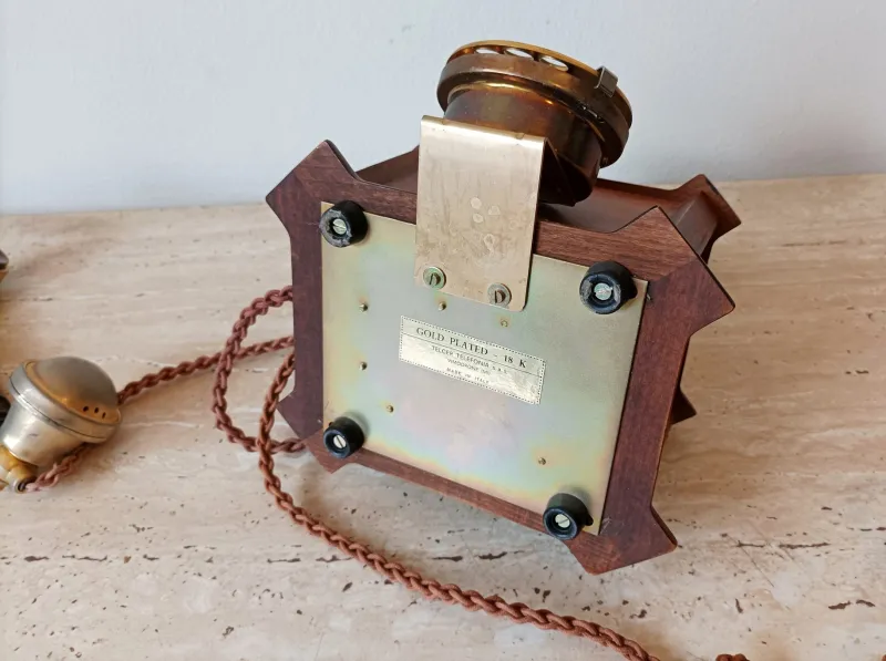 Starožitný elegantní stolní telefon značky Telcer Telefonia Vimodrone oživí každou místnost svým retro kouzlem. Tento majestátní kousek s otočným pozlaceným číselníkem je v perfektním mechanickém stavu — číselník se hladce otáčí a pohotově vrací zpět, zatímco vidlice, která podpírá sluchátko, bez problémů reaguje na manipulaci. Originální pletené šňůry zůstaly zachované v původním, nepoškozeném stavu, což umocňuje jeho autentičnost. Zadní strana telefonu skrývá dvojici zvonků, které sloužily k vyzvánění, což ještě více umocňuje jeho historický šarm. Telefon je celkově ve velmi dobrém vizuálním stavu, drobné známky stáří mu ovšem dodávají charakter a pravou vintage atmosféru. Tato výjimečná sběratelská lahůdka představuje nejen praktický kousek historie, ale také stylový doplněk do interiéru. Skvěle zapadne do bytu, kanceláře nebo na jakékoli místo, kde hledáte ten správný retro nádech.