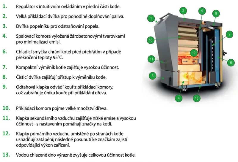 Velká spalovací komora umožňuje delší intervaly mezi přikládáním a zajišťuje pohodlný provoz. Moderní řídicí jednotka automaticky reguluje výkon podle aktuálních potřeb, takže topení je přesné a efektivní.